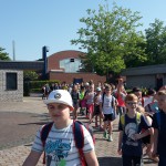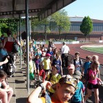 Zunächst lief die ganze Schule gemeinsam zum Sportplatz. Dort versammelten wir uns auf der Tribühne, um anschließend zum jeweiligen Startplatz zu gehen. Um Punkt 10:00 Uhr fiel der Startschuss und jeder Jahrgang begann den Sponsorenlauf an seinem Startpunkt.