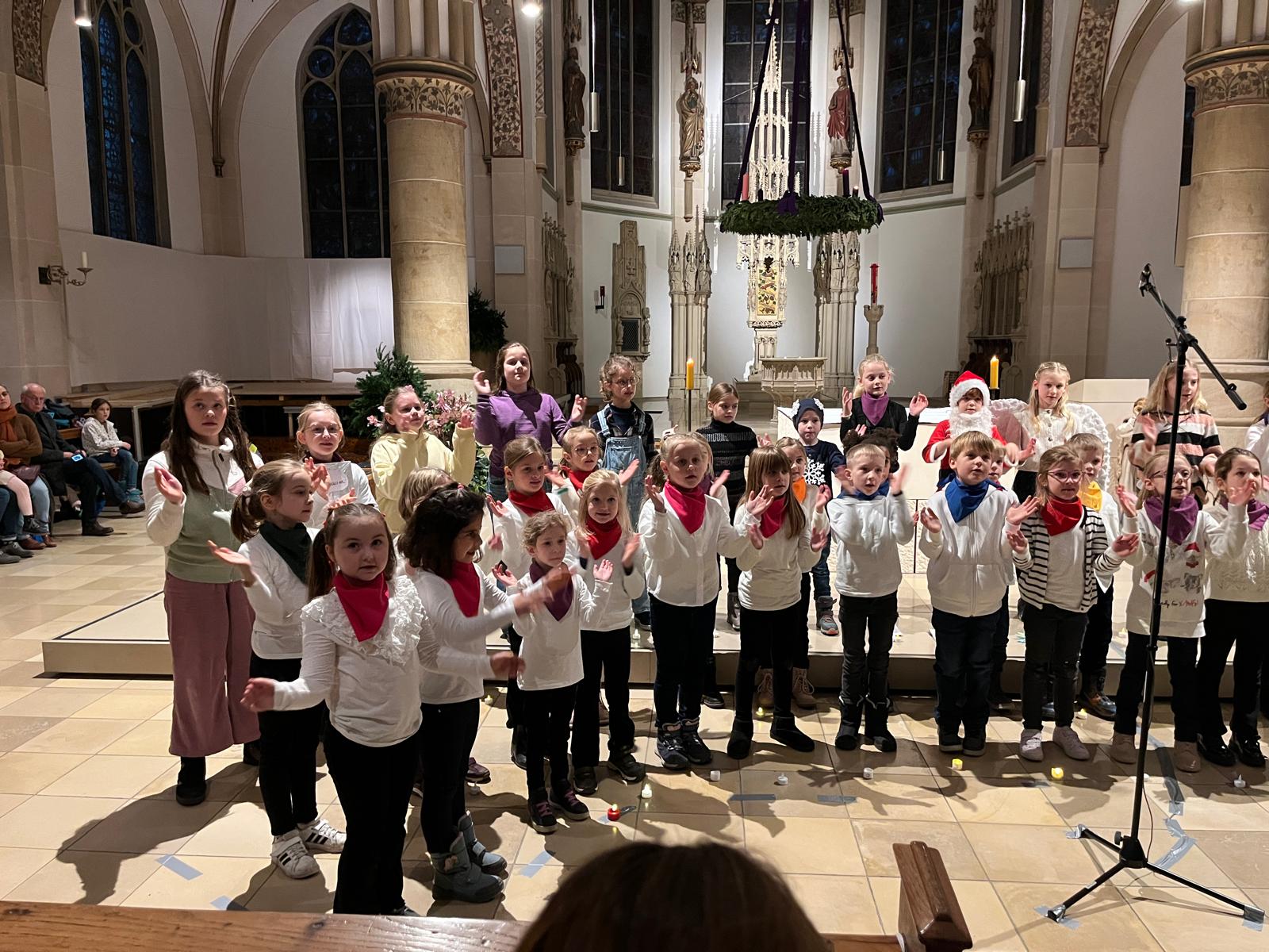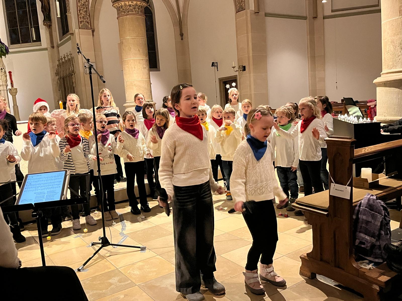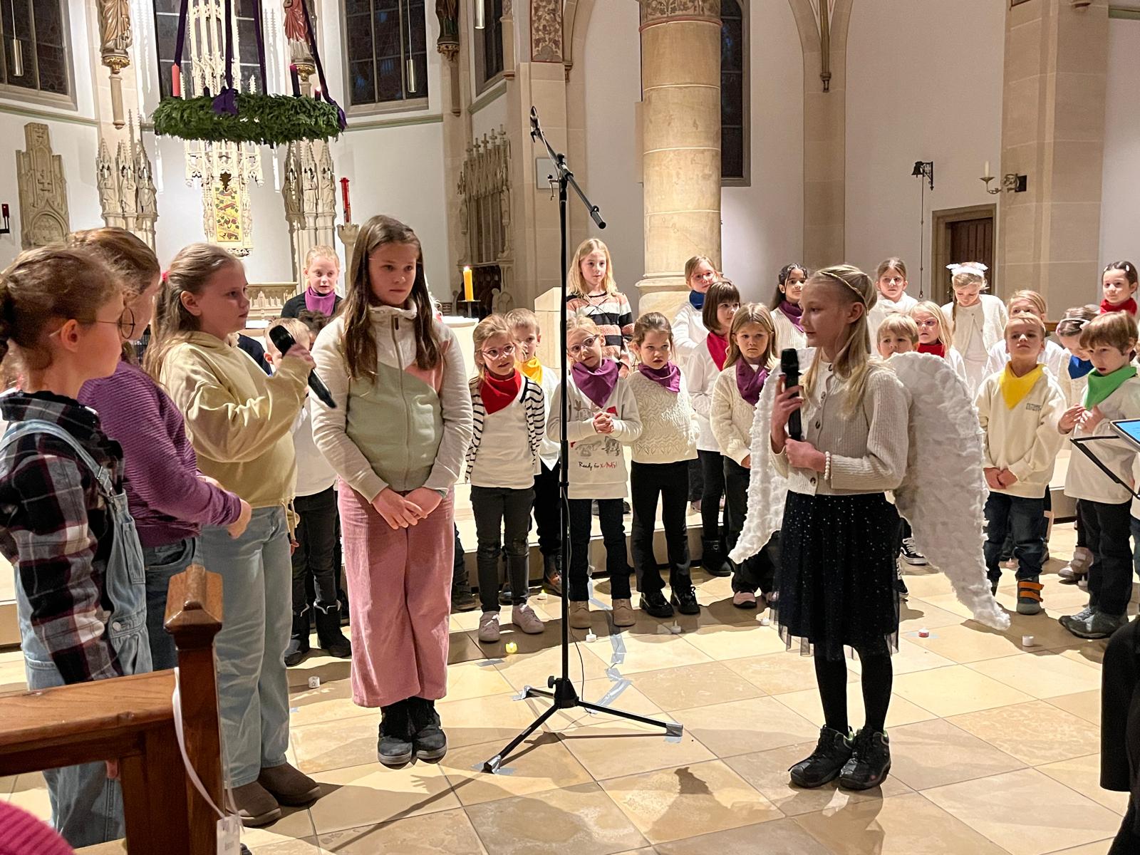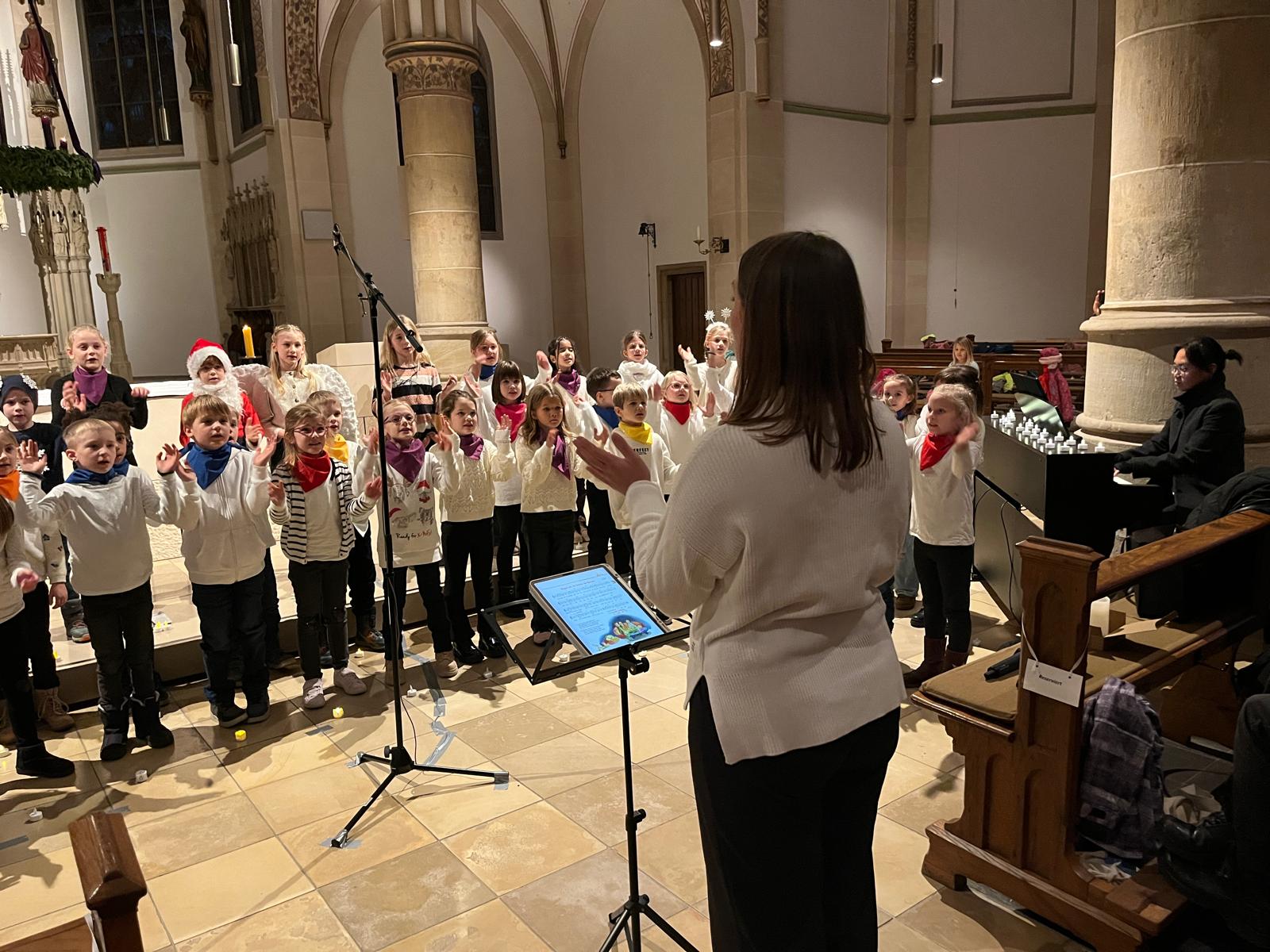 Unter der musikalischen Leitung von Aline Klieber, begleitet am Klavier von Lilian Sutikdja, erklangen stimmungsvolle Chorlieder, teilweise mit mutig vorgetragenen Solis einiger Kinder. Dazwischen wurde die Geschichte „Weihnachten fällt aus …“ von den Kindern mit viel Spielfreude erzählt und gespielt.