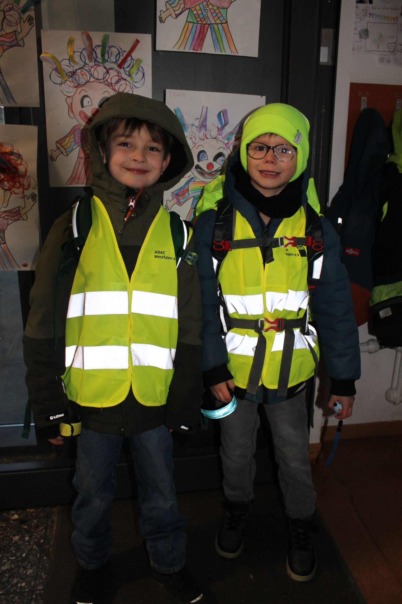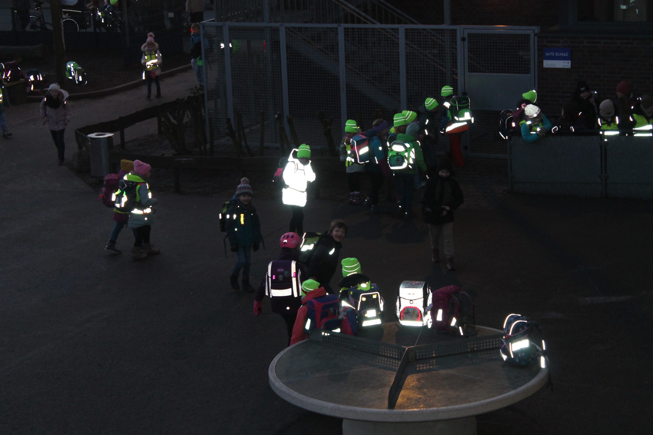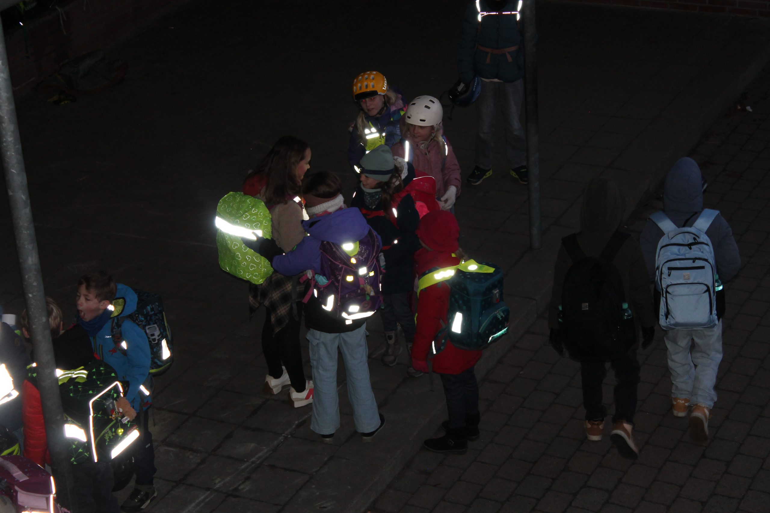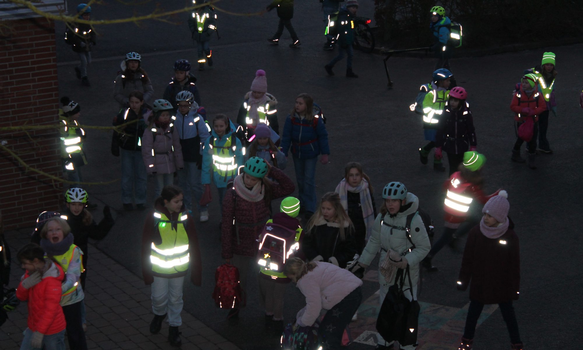 Am Montag kamen alle „Glühwürmchen“ der Dietrich-Bonhoeffer-Schule wieder  so sichtbar wie möglich zur Schule. Mützen, Westen, Blinkies und vieles mehr sorgten für Sicherheit durch Sichtbarkeit.