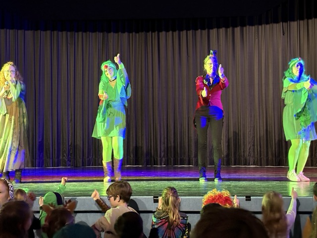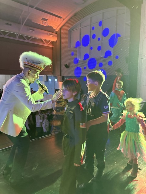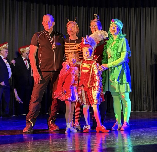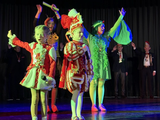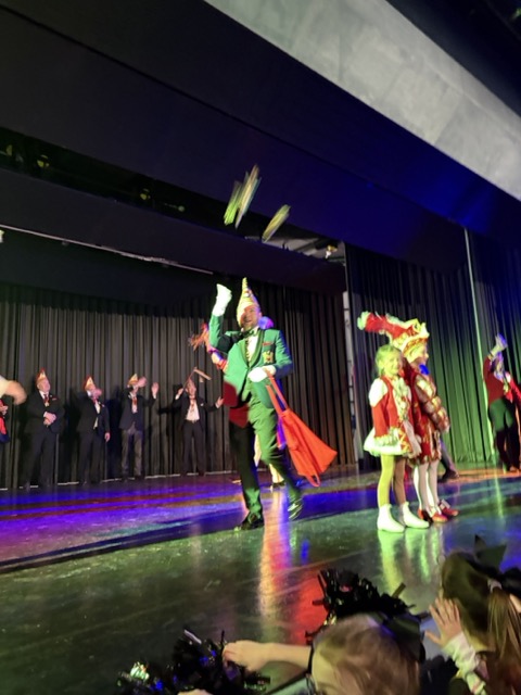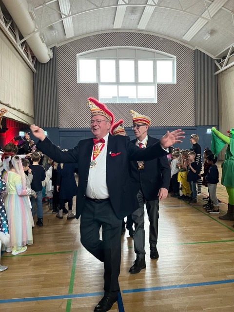 Dann kam der groĂe Höhepunkt: Die Kinder bildeten ein langes Spalier, klatschten und jubelten und feierlich zogen Prinz Theo und seine Adjutantin Mila ein! Unter tosendem Applaus betraten sie die BĂŒhne. Als nĂ€rrische BeschĂŒtzer der Bonhoeffer-Gemeinschaft hatten sie  neben Liedern auch Ehrungen und herzliche Worte im GepĂ€ck: Frau Wulff, Guido, sowie Theos Klassenlehrerinnen Frau Grundke und Frau Wilcke wurden geehrt.