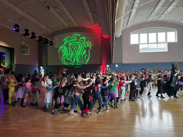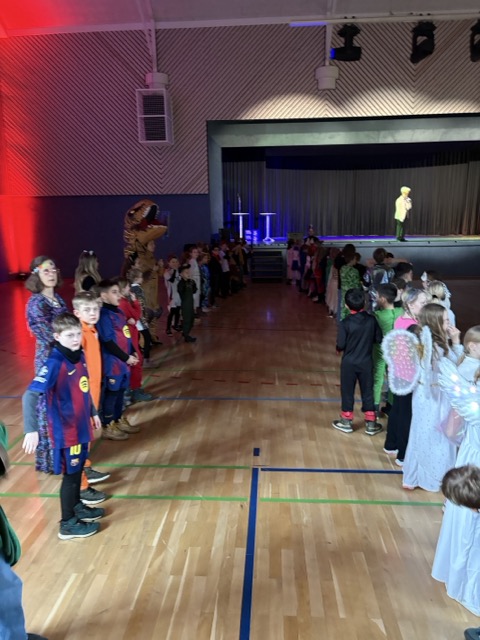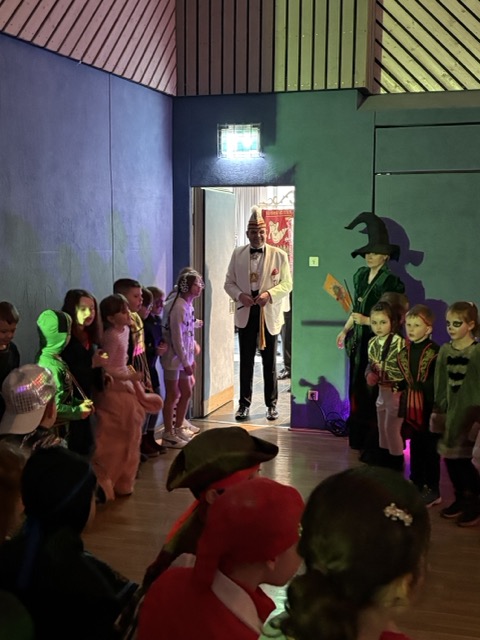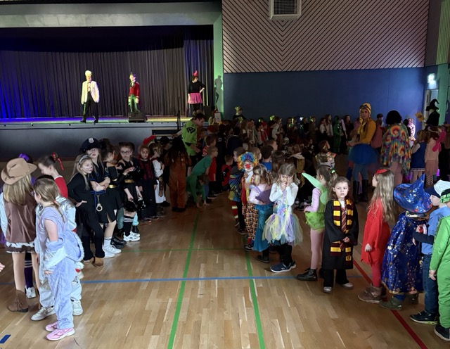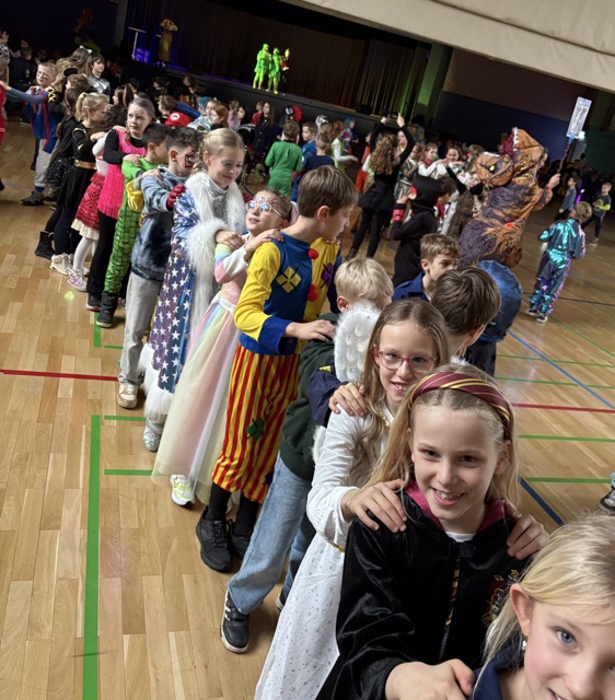 Los ging das nĂ€rrische Treiben noch in der Schule, doch dann setzte sich eine kunterbunte Karawane in Bewegung:  In einem fröhlichen Zug marschierte die ganze Schulgemeinschaft zur Steverhalle. Piraten, Prinzessinnen, Tiere, Superhelden und auch einige ohne KostĂŒm â alle gehörten dazu. Unsere ErstklĂ€sslerInnen reisten  mit dem Bus an.