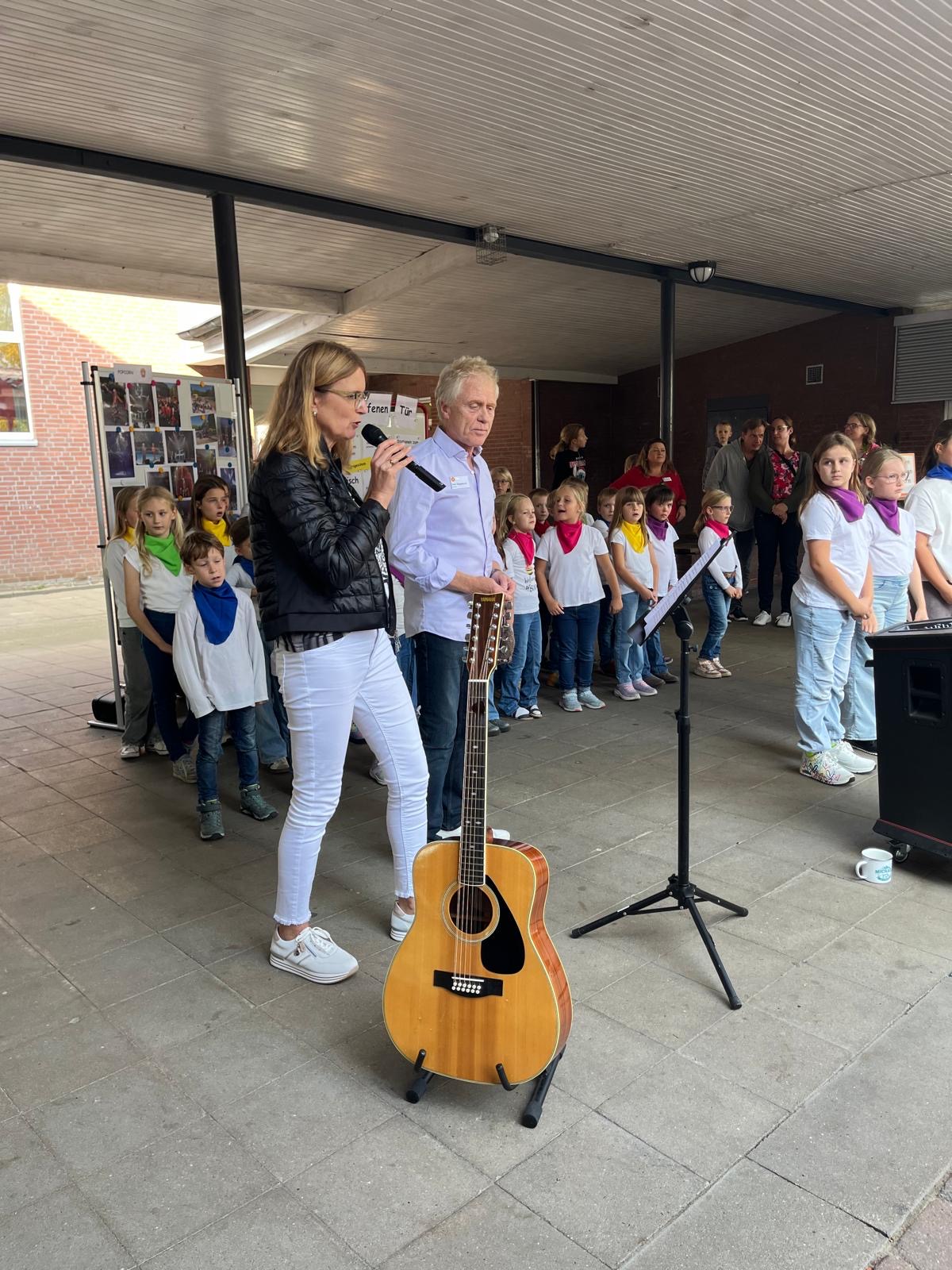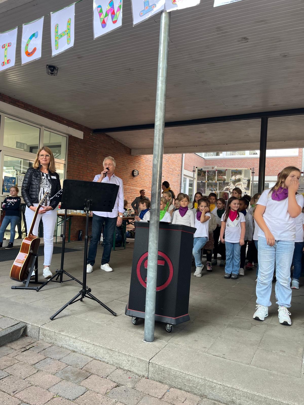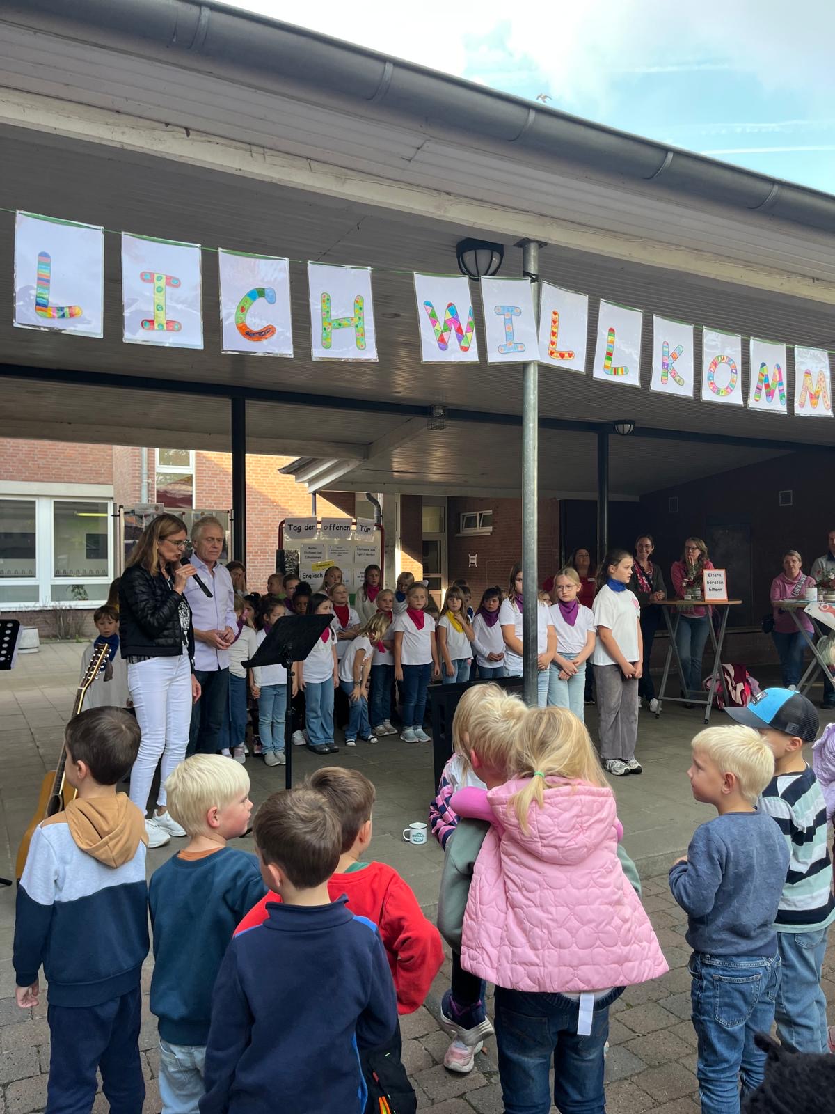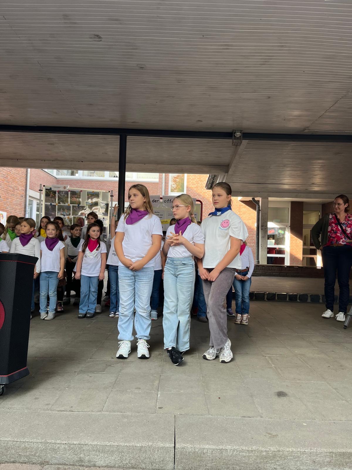 Nach der Begrüßung durch den Chor mit dem Lied „Hallo, hallo“ und das Schulleitungsteam folgte ein geistlicher Impuls von Vikarin Sarah Schöning und Gemeindereferentin Monika Kellermann.
